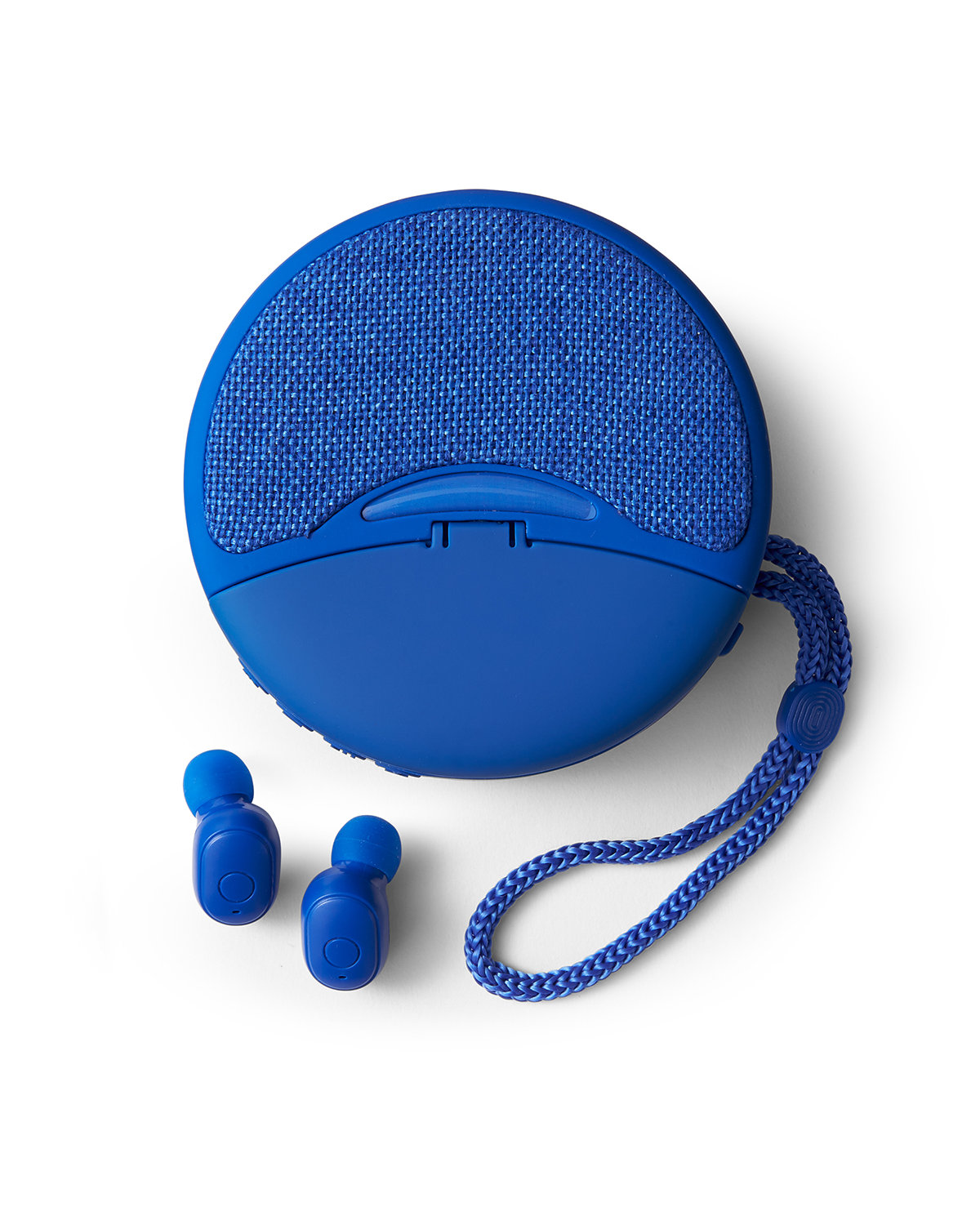 Multi-function tech accessory with Rubberized finish ABS Plastic and Polyester case featuring wireless earbuds and speaker. Earbuds charge in a compact case that can also be used as a phone stand. Power/Technology: Rechargeable Speaker Battery capacity: 500 mAh; Rechargeable Earbuds battery capacity: 40mAh* 2; Transmission range: 10M (30 feet); Wireless V5.0. Includes microphone / call answer feature. Earbuds must be charged prior to first use. Charging time: 1 hour. Playback Time: 2 hours. Includes instructions and USB charging cable. 1.1200″ H x 3.7500″ Diameter