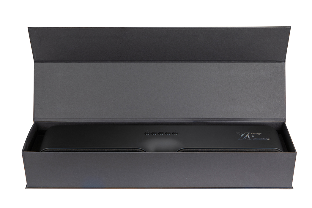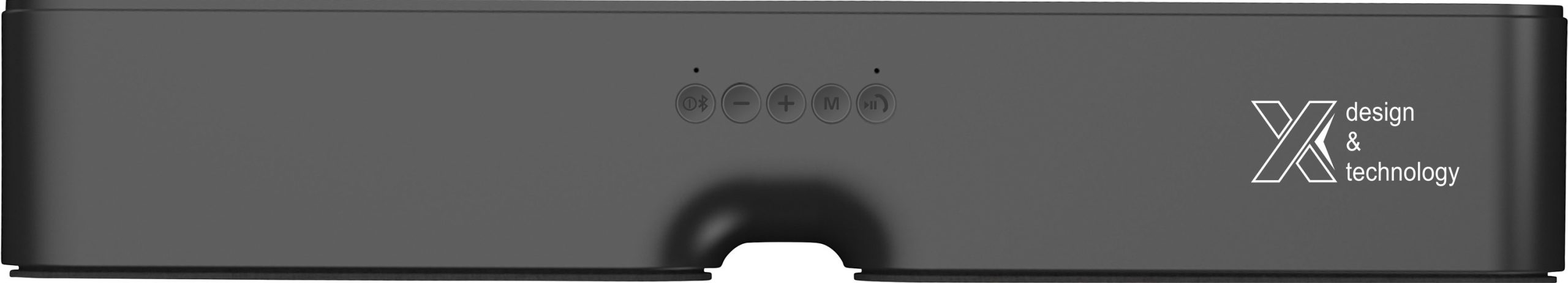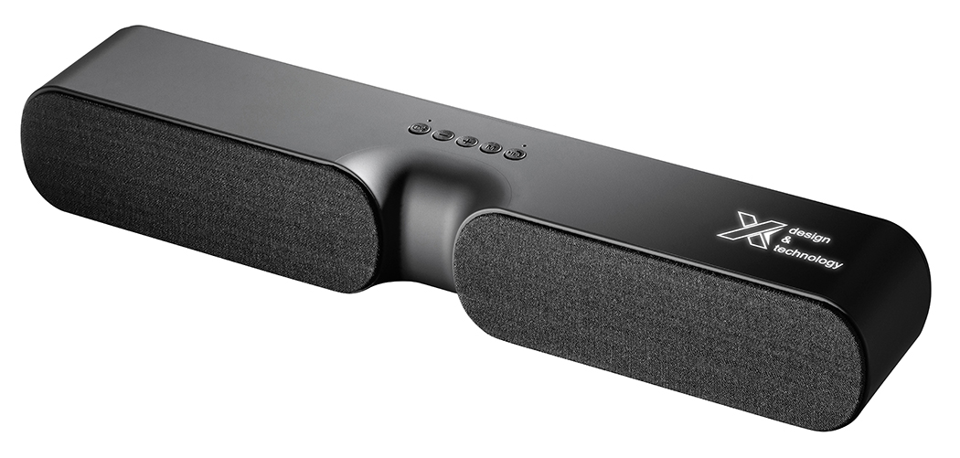 Enjoy better sound from your TV or any Bluetooth-compatible device with this 2 x 5W sound bar speaker. Its sleek rubberized finish and illuminated logo make it stylish, and a built-in microphone for teleconferencing lends extra function. Includes an RPET charging cable, premium gift box, and 3-year warranty. Patent pending. 15″ W x 2.375″ H x 2.5625″ D